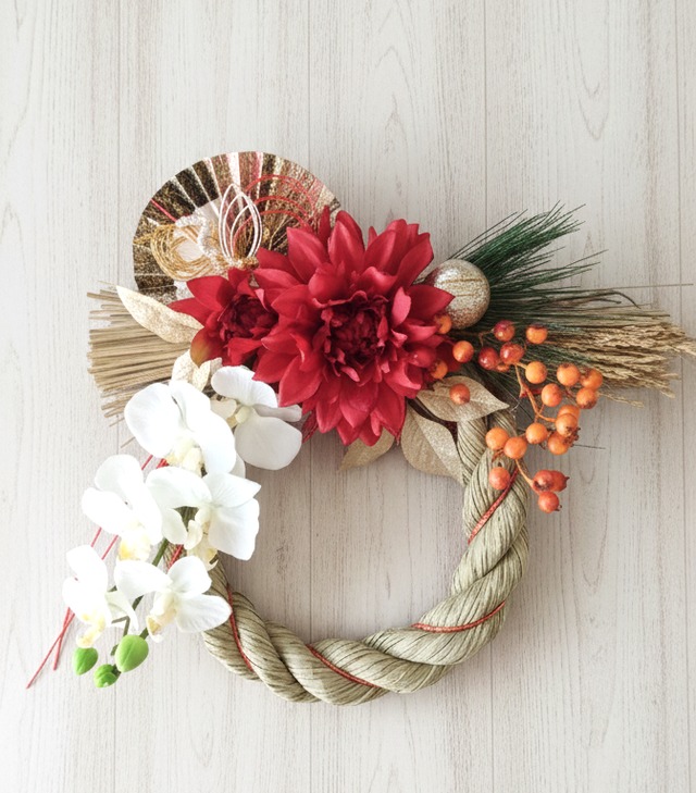 華やぎを添える、迎春の主役。 深みのある赤いダリアを主役に、 胡蝶蘭や金扇を添えた、 華やかさが際立つ迎春しめ飾り。 凛とした赤と、 きらりと光を受けるゴールドの組み合わせが、 新しい一年の幕開けを力強く彩ります。 存在感がありながらも、 品よくまとまったデザインで 玄関の主役としておすすめの一品です。 アーティフィシャルフラワーのため、 年末に届いて、そのまま安心して飾れます。 高品質なアーティフィシャルフラワーでお作りしていますので 玄関扉の外にも安心して飾っていただけます。 ◆花材・・・ダリア、蘭など/すべてアーティフィシャルフラワー しめ縄/自然素材 ◆サイズ・・・縦 約30㎝ × 幅 約38㎝ ★アーティフィシャルフラワーの美しさを長く楽しんでいただくための取り扱い説明書を同梱致しますので 初めて手にされる方にも安心してお贈りいただけます。