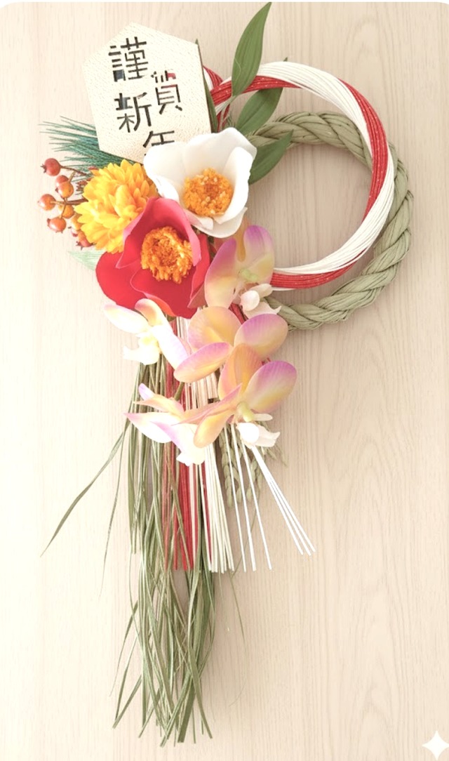 紅白の花々と、 扇や水引をあしらった 祝いの気持ちを込めた迎春しめ飾り。 動きのある八の字を描くしめ縄が 新しい一年の広がりと繁栄を感じさせます。 玄関に飾るだけで きちんとした迎春のしつらえが整う 存在感のある一品です。 高品質なアーティフィシャルフラワーでお作りしていますので 玄関扉の外にも安心して飾っていただけます。 ◆花材・・・椿、葉牡丹、梅、オンシジウムなど/すべてアーティフィシャルフラワー しめ縄/い草(自然素材) ◆サイズ・・・縦 約38cm×横 約24cm ★アーティフィシャルフラワーの美しさを長く楽しんでいただくための取り扱い説明書を同梱致しますので 初めて手にされる方にも安心してお贈りいただけます。