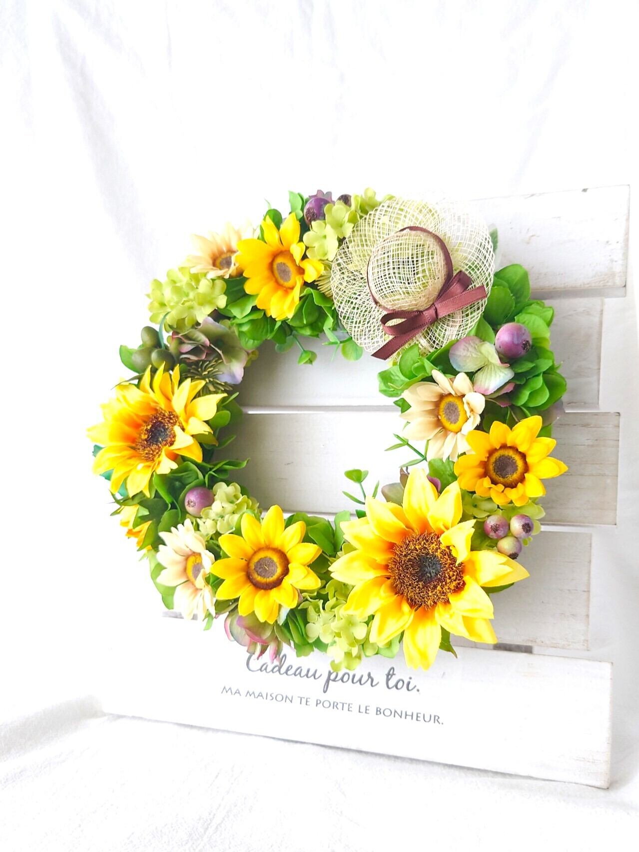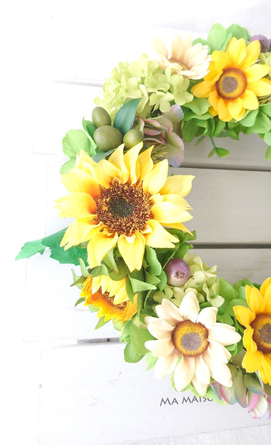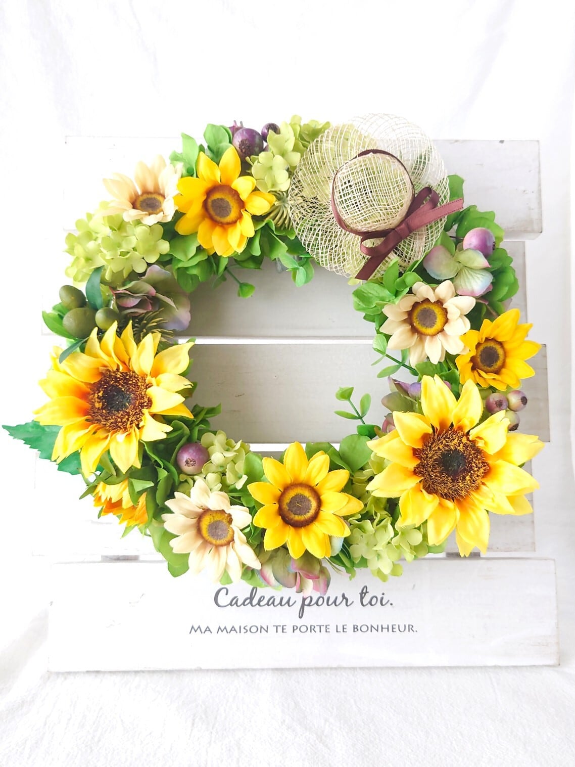 ◇花材・・・ひまわり/スノーボール/アジサイ/Oオリーブ/ベリーなど